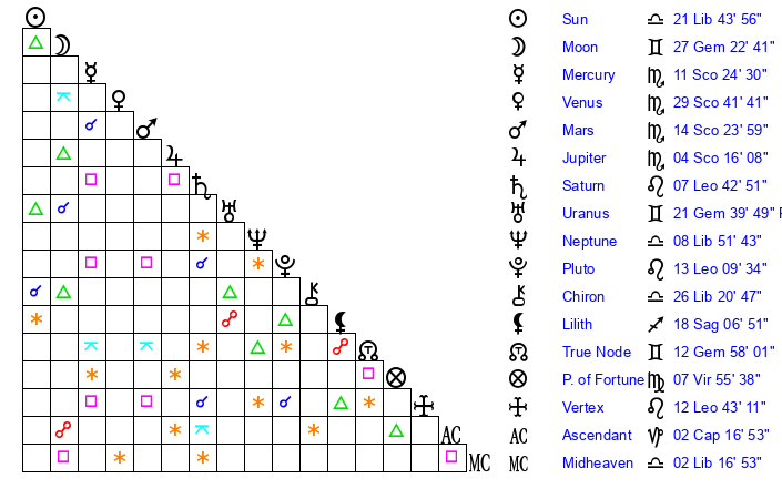 | Sun | 21 Libra 44 | 22 Libra 35 | 11 Capricorn 28 |