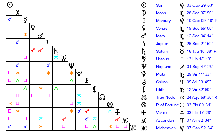 | Moon | 28 Scorpio 34 | 4 Scorpio 20 | 19 Scorpio 0 |