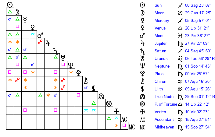 | Neptune | 1 Scorpio 15 | 29 Pisces 27 | 2 Scorpio 35 |
