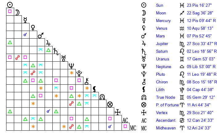 | Jupiter | 27 Scorpio 26 | 13 Gemini 37 | 20 Scorpio 25 |