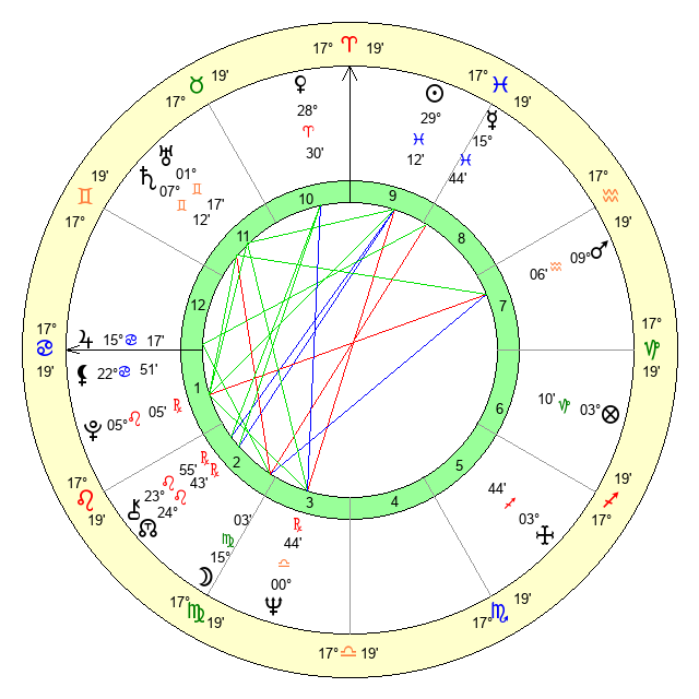 | Sun | 29 Pisces 13 | 0 Aries 20 | 18 Gemini 56 |
