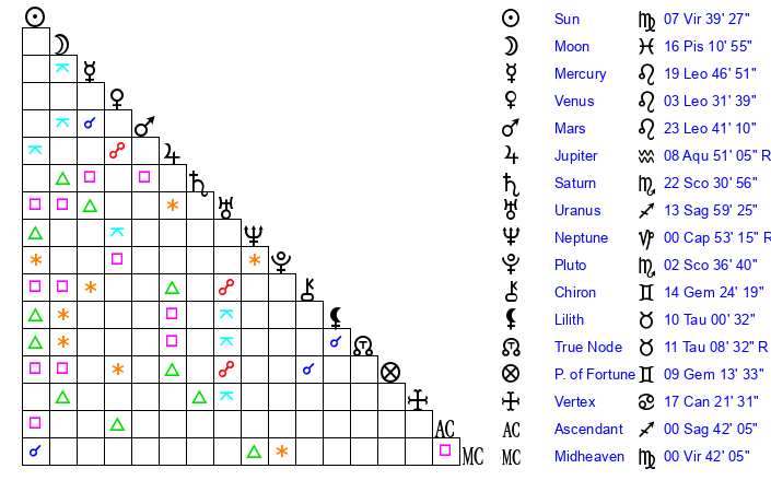 Saturn | 22 Scorpio 48 | 29 Pisces 58 | 26 Scorpio 0 |