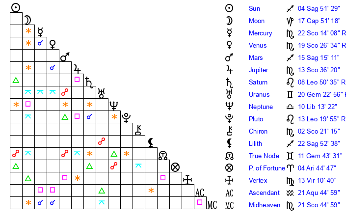 | Sun | 4 Sagittarius 51 | 5 Sagittarius 42 | 25 Aquarius 10 |