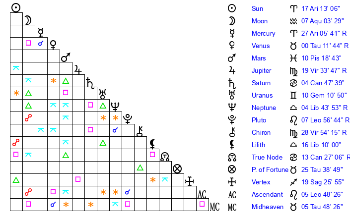 | Mercury | 27 Aries 5 | 26 Pisces 50 | 16 Cancer 38 |