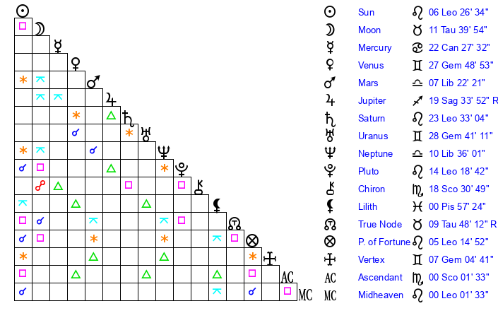 | Moon | 11 Taurus 30 | 5 Libra 49 | 13 Pisces 53 |