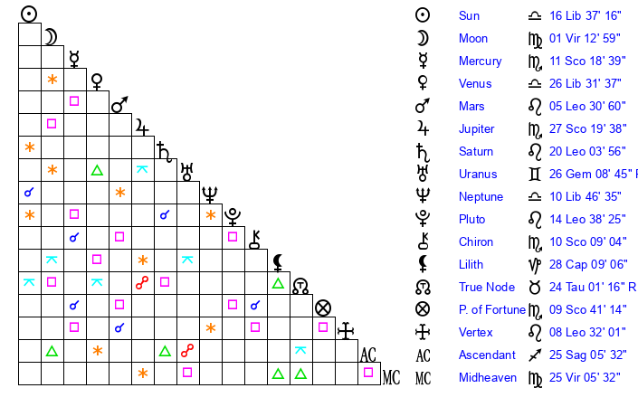 | Moon | 1 Virgo 10 | 8 Gemini 16 | 4 Cancer 16 |