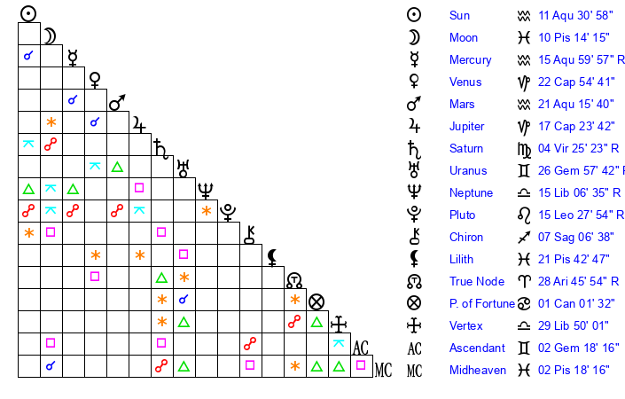 | Mercury | 15 Aquarius 59 | 5 Aquarius 54 | 2 Taurus 18 |