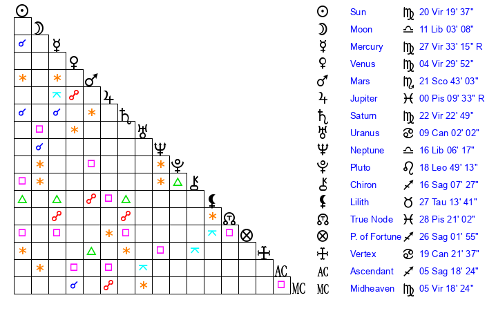 | Sun | 20 Virgo 19 | 21 Virgo 9 | 4 Sagittarius 53 |