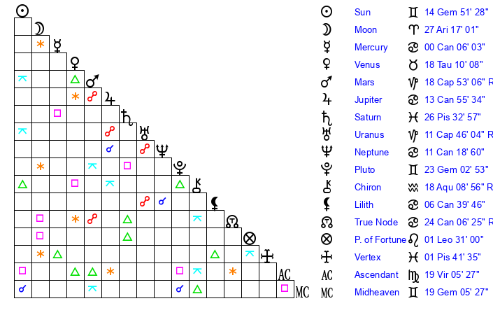 | Sun | 14 Gemini 52 | 16 Gemini 17 | 8 Libra 23 |
