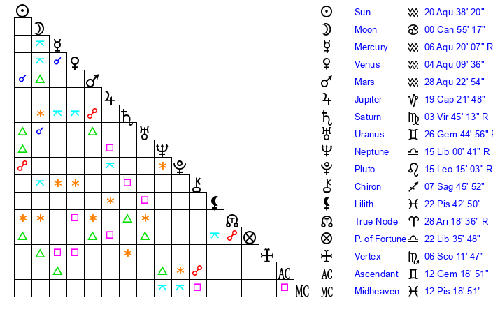 | Moon | 0 Cancer 56 | 16 Cancer 46 | 18 Aries 13 |