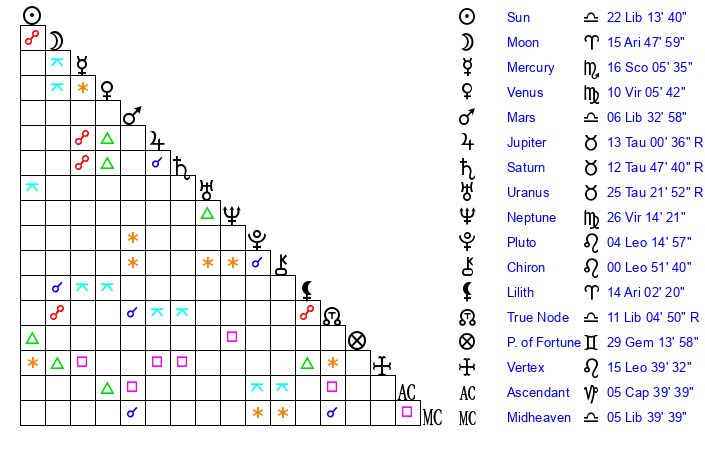 | Sun | 22 Libra 14 | 22 Libra 38 | 18 Capricorn 6 |