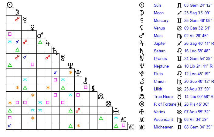 | Sun | 3 Gemini 24 | 3 Gemini 46 | 16 Leo 59 |