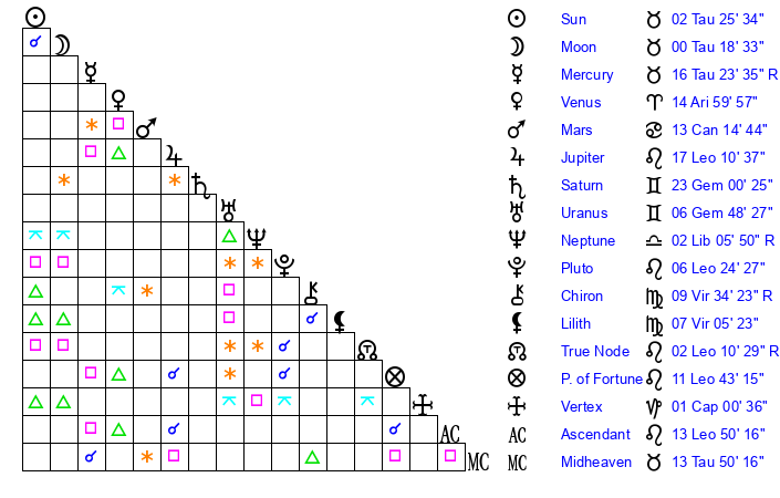| Moon | 0 Taurus 22 | 22 Aquarius 59 | 18 Aries 9 |