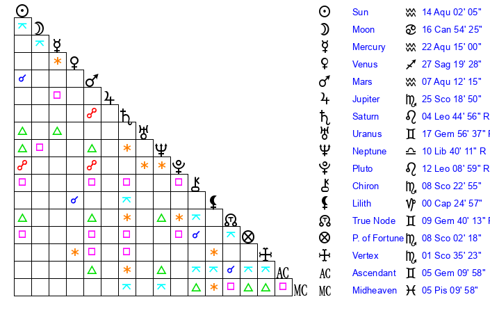 | Sun | 14 Aquarius 2 | 15 Aquarius 7 | 1 Taurus 43 |