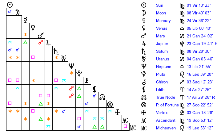 | Moon | 8 Virgo 33 | 18 Virgo 54 | 17 Gemini 21 |