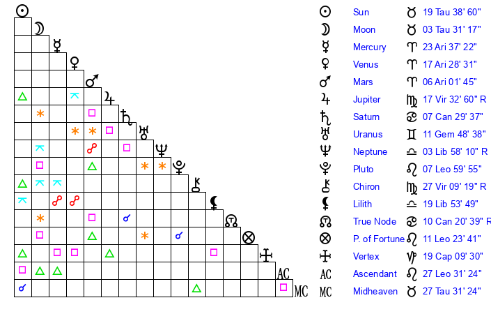 | Sun | 19 Taurus 39 | 20 Taurus 17 | 6 Leo 11 |