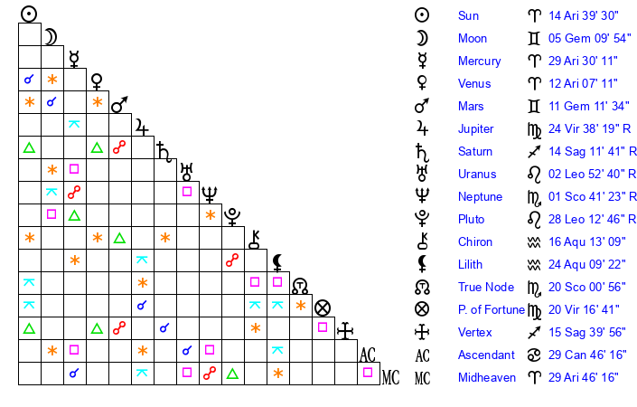 | Sun | 14 Aries 39 | 15 Aries 10 | 20 Gemini 29 |