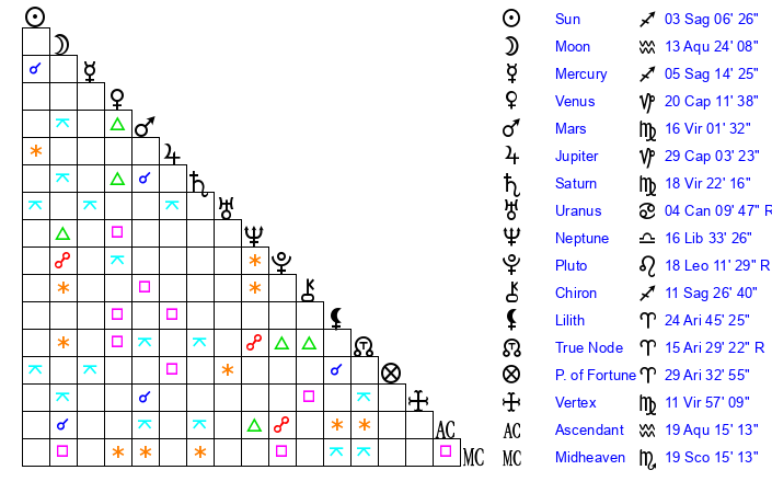 | Moon | 13 Aquarius 31 | 3 Aquarius 30 | 19 Scorpio 31 |