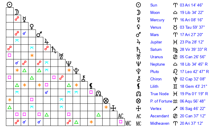 | Sun | 3 Aries 15 | 4 Aries 18 | 15 Gemini 10 |