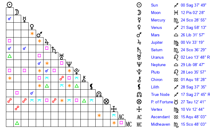 | Sun | 0 Sagittarius 37 | 1 Sagittarius 39 | 11 Aquarius 49 |