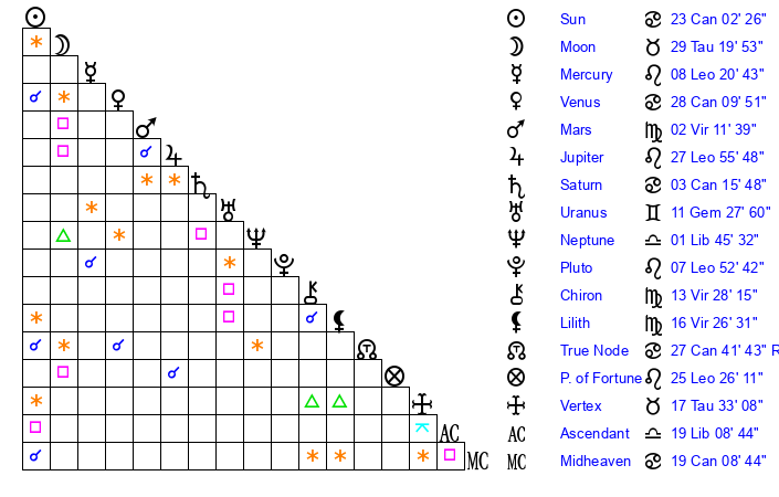 | Moon | 29 Taurus 15 | 23 Pisces 19 | 16 Taurus 43 |