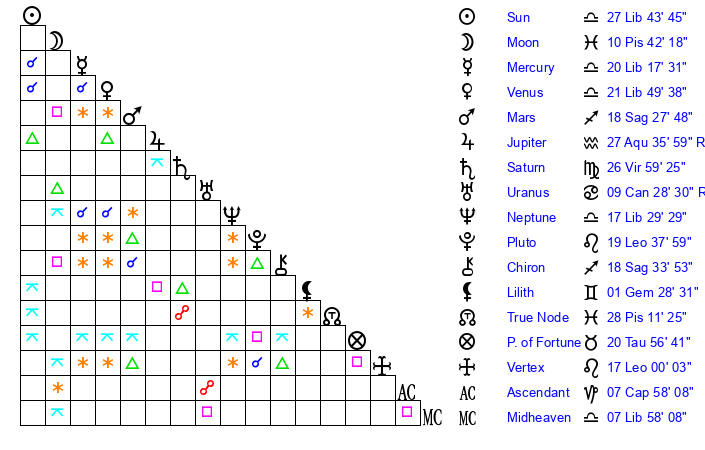 | Neptune | 17 Libra 29 | 0 Aries 0 | 19 Libra 27 |