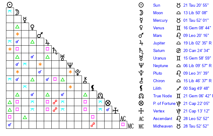 | Sun | 21 Taurus 21 | 22 Taurus 13 | 6 Leo 55 |