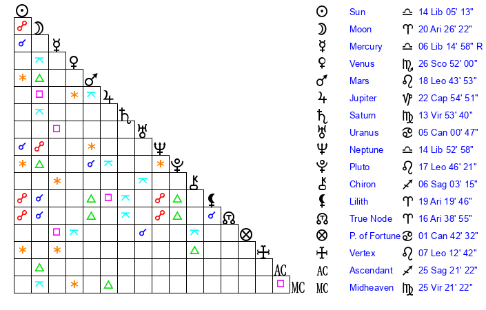 | Neptune | 14 Libra 53 | 0 Aries 21 | 17 Libra 8 |