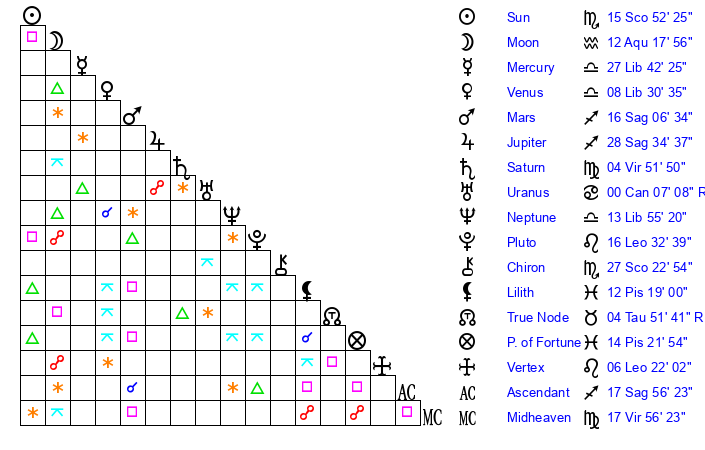| Sun | 15 Scorpio 52 | 16 Scorpio 27 | 3 Aquarius 3 |