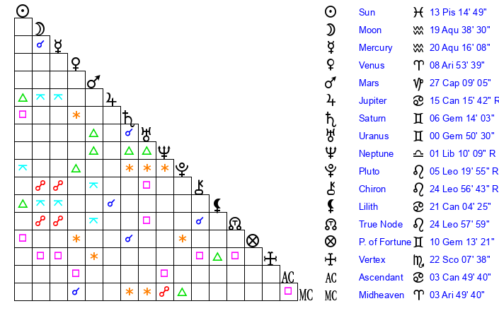 | Sun | 13 Pisces 15 | 14 Pisces 22 | 3 Gemini 36 |