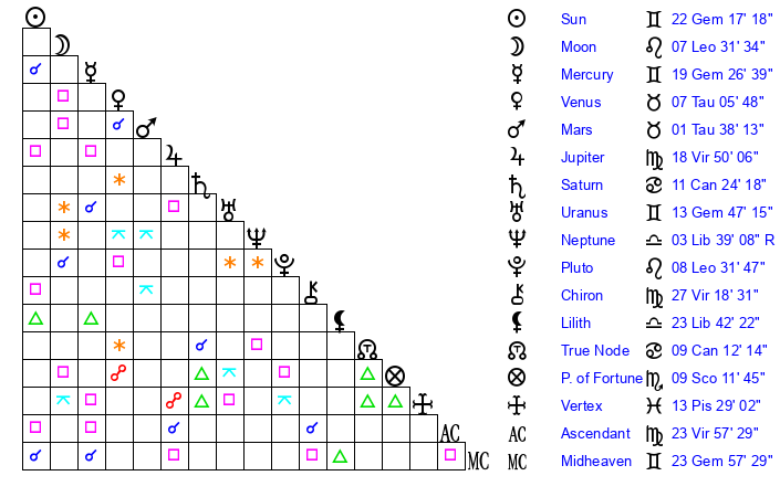 | Sun | 22 Gemini 18 | 22 Gemini 56 | 8 Virgo 52 |