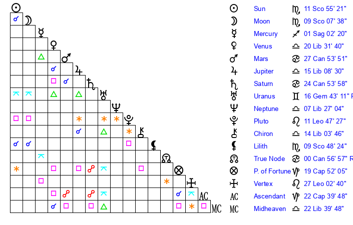 | Sun | 11 Scorpio 55 | 12 Scorpio 32 | 3 Aquarius 6 |