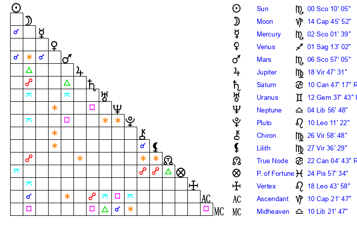| Sun | 0 Scorpio 10 | 0 Scorpio 32 | 22 Capricorn 9 |
