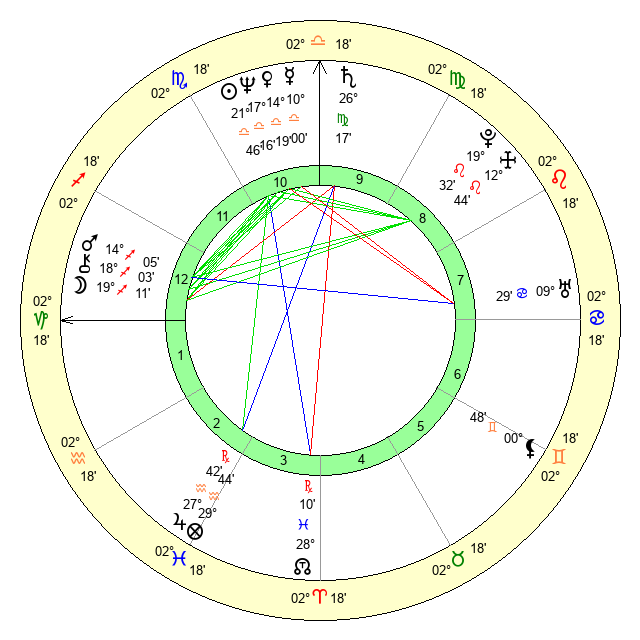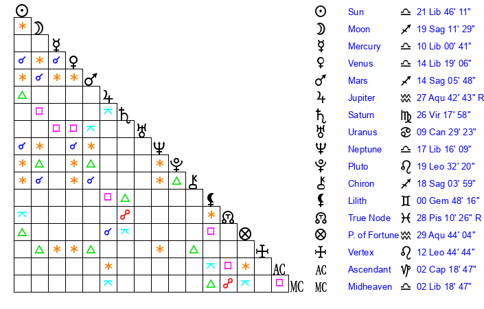 | Saturn | 26 Virgo 46 | 26 Pisces 36 | 2 Libra 43 |