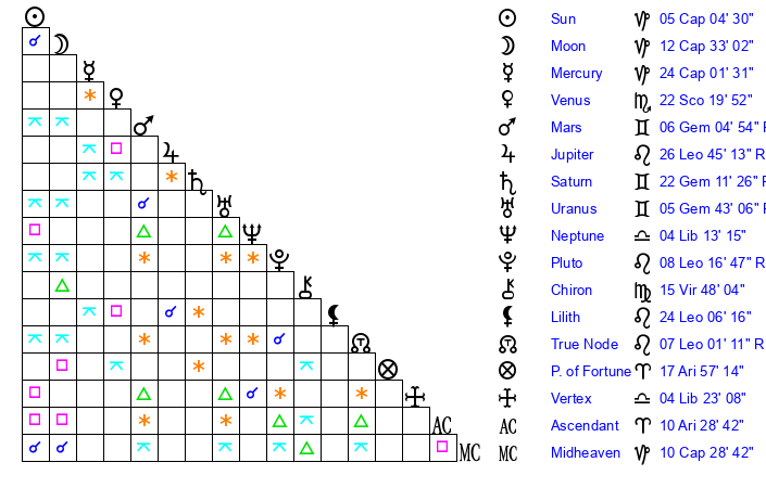 | Moon | 12 Capricorn 24 | 5 Aries 7 | 9 Capricorn 0 |