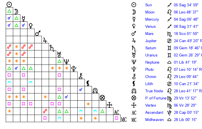 | Moon | 6 Leo 49 | 8 Pisces 32 | 21 Leo 18 |