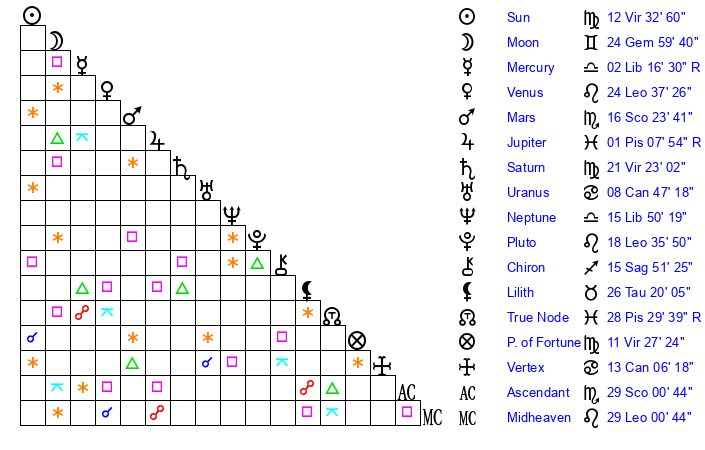 | Sun | 12 Virgo 33 | 13 Virgo 23 | 26 Scorpio 48 |
