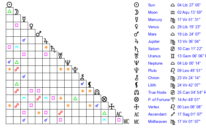 | Venus | 29 Libra 20 | 10 Virgo 1 | 7 Aquarius 44 |