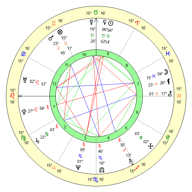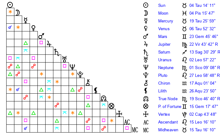 | Venus | 6 Taurus 53 | 27 Pisces 7 | 0 Leo 19 |