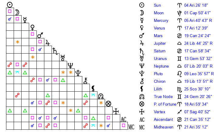 | Sun | 4 Aries 27 | 5 Aries 18 | 21 Gemini 6 |