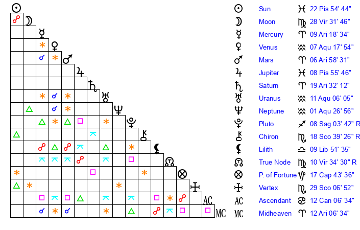 | Sun | 22 Pisces 55 | 23 Pisces 22 | 19 Aries 38 |