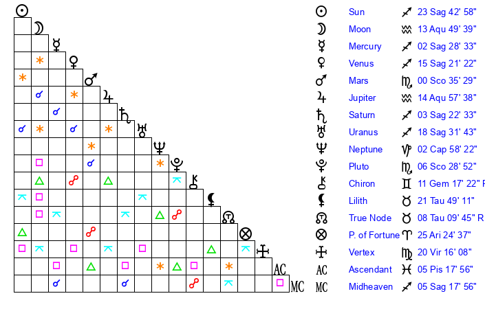 Sun | 23 Sagittarius 43 | 24 Sagittarius 16 | 3 Aquarius 27 |