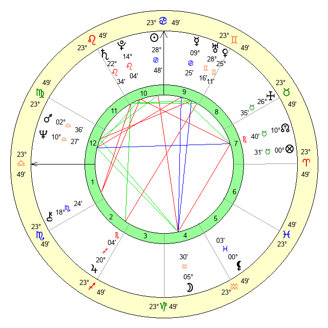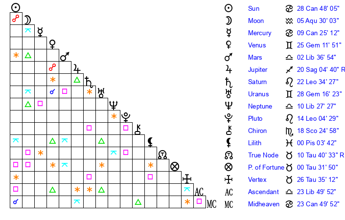 | Sun | 28 Cancer 48 | 29 Cancer 11 | 13 Libra 20 |