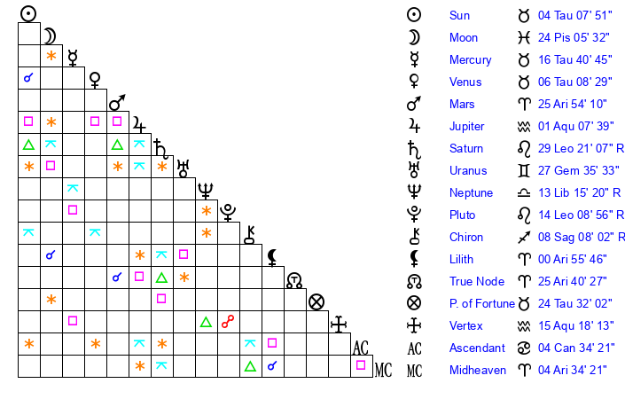 | Moon | 24 Pisces 2 | 20 Pisces 39 | 8 Capricorn 53 |