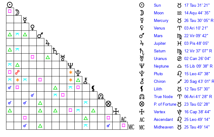 | Sun | 17 Taurus 31 | 18 Taurus 21 | 29 Cancer 18 |