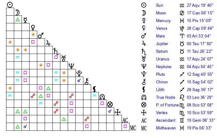 | Neptune | 4 Aquarius 54 | 28 Pisces 27 | 5 Aquarius 43 |
