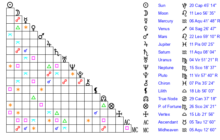 | Moon | 11 Leo 53 | 23 Gemini 27 | 11 Scorpio 22 |