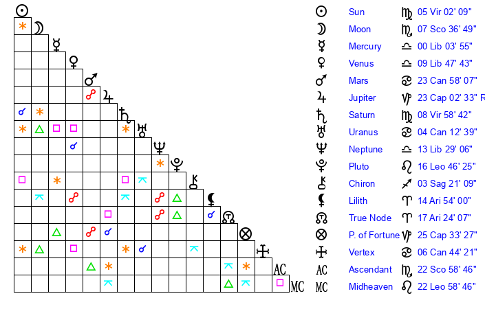 | Venus | 9 Libra 48 | 3 Leo 36 | 6 Capricorn 57 |
