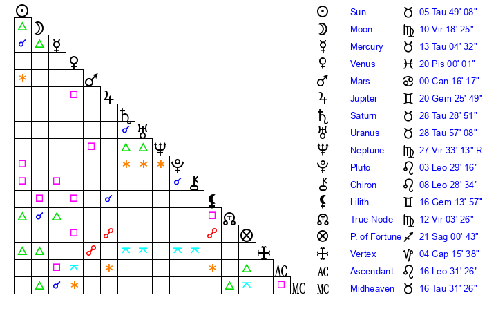 | Sun | 5 Taurus 49 | 6 Taurus 43 | 25 Cancer 25 |
