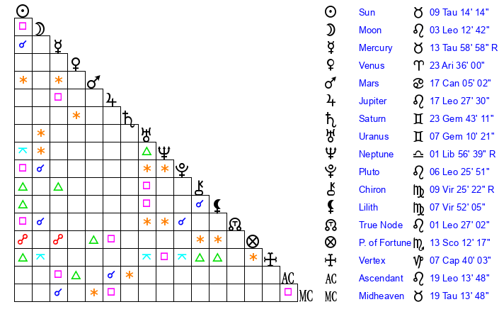 | Venus | 23 Aries 36 | 29 Pisces 27 | 3 Leo 6 |